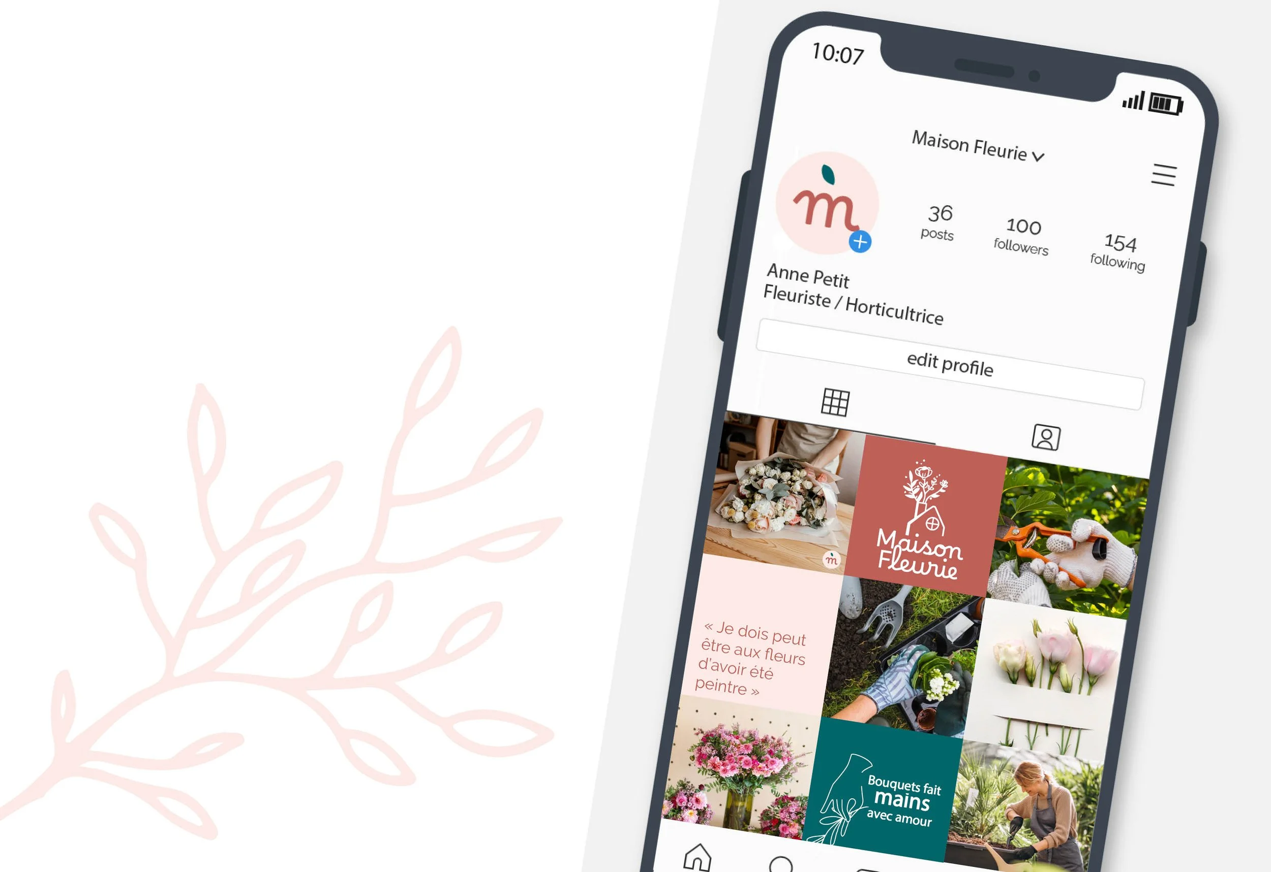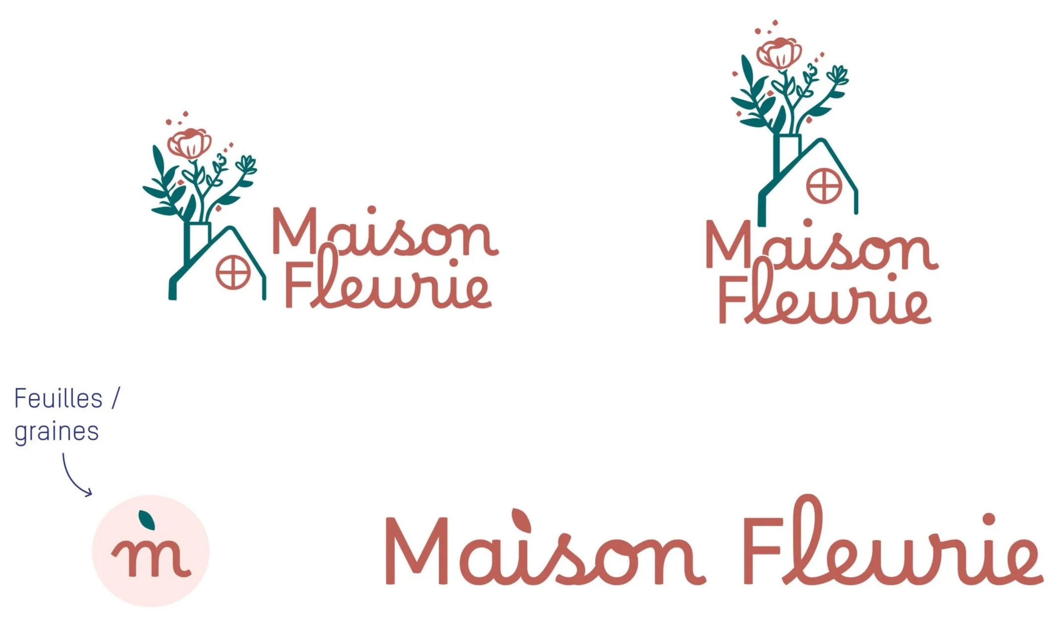 Pour le mot «maison», j’ai opté pour une typographie en «script» afin d’apporter une touche de douceur grâce à ses arrondis. Elle rappelle les fleurs. Le mot «fleurie» est sans empattement contrastant avec le mot maison. Les lettres peuvent rappeler les tiges des plantes. Cela démontre la stabilité de l’entreprise.